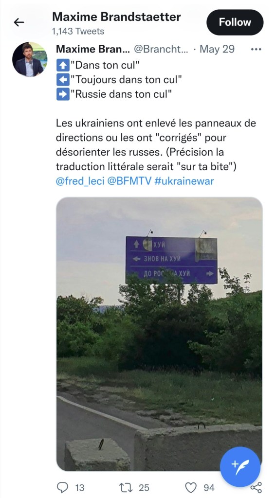 La France apparaît modérée à beaucoup d’Ukrainiens et de supporters occidentaux les plus virulents. C’est bien ingrat, car elle a réaffirmé sa volonté d’armer l’Ukraine et il reste probable à ce jour, que des fonctionnaires français en activité aient été tués ou capturés, lors de la précédente défaite ukrainienne à Marioupol.