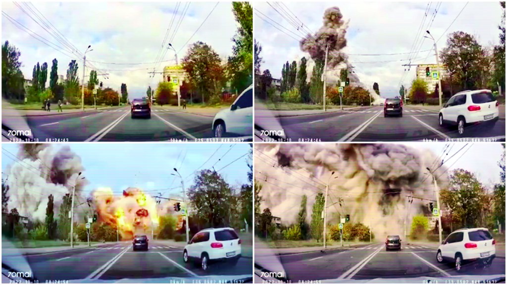 As retaliation for the vehicle-born explosive device (VBIED) attack that the Ukrainian military intelligence (GUR) has conducted on October 8 against Crimea bridge, in the context moreover of the deliberate Ukrainian terrorist shelling for eight years of residential areas in Donbass, where no troops nor military value facilities are settled, Russia carries out on October 10, 2022, a heavy strategic offensive, with missiles and Iranian drones, all over Ukraine