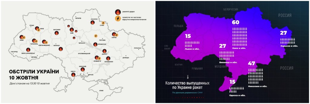The extend of the strikes is assessed on Ukrainian (left) and Russian (right) channels of social networks. The difference between the shapes of maps is the referendum on September 27, when voters in Zaporojie, Kherson, Donetsk and Lugansk regions have chosen their return to the Russian Federation