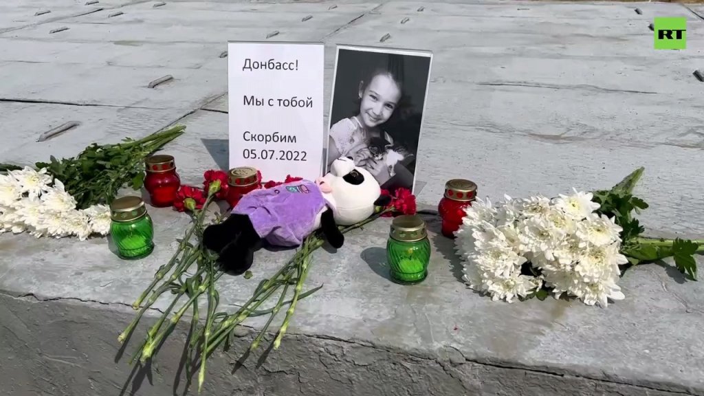 On Donetsk People’s Republic square, Moscow, in front of the US embassy, people pay tribute to Veronica, whom a M777 howitzer has killed in Donetsk the day before. Six more civilians, including four children, are slaughtered that day