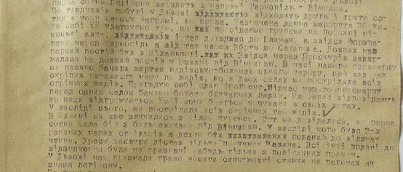 The first hundred [company] of the Legion will drive in the Tarnopil-Vinnytsia direction. After a week’s daily life in Lviv, the second and third depart in the same direction as the first. The designated daily route is 30 km. We make it easier for ourselves by sitting in groups on empty German cars and there we drive to Glynyk, and from there we drive through Ternopil, and from there through Zbruch to Saganiv village. Our first stop was in Michalpol. From there, through Proskuriv, they stopped for a longer stay in Yuzvin near Vinnytsia. During our permarch, we witnessed the victims of the Jewish-Bolshevik terror, this sight also cemented our hatred for the Jews, that in two villages we shot all the Jews in the ribbon. I remember one fragment. During our permarch, many wandering people were seen in front of one village. The answer to the question is that the Jews are threatening them and they are afraid to spend the night in their houses. As a result of this, we shot all the Jews there. In Yuzvin, we have already connected with a whole group of people. Here we learned that the first hundred had a battle with the Bolsheviks near Vinnytsia. As a result, 3 of our shooters were wounded, and some were sent to the memorial service. Only Lieutenant Kalina received the Cross of Merit. All others submitted for recognition were not recognized, perhaps only for political reasons. In Lviv, we were granted the right to wear blue and yellow [Ukrainian national colors] ties on epaulettes as a legion banner