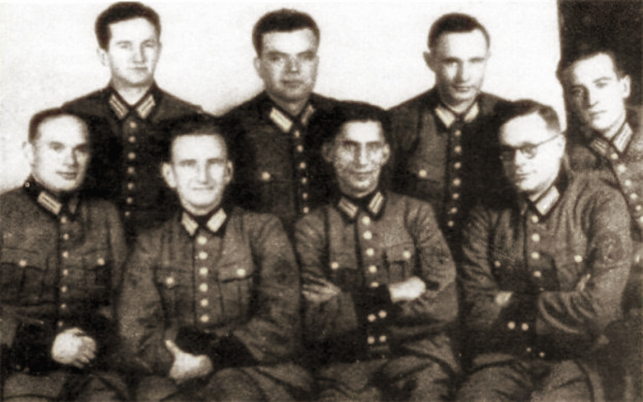 The assassins are members of the Schutzmannschaft Bataillon 118, a Ukrainian auxiliary police formation. Its last alive member, machine gunner Vladimir Katriuk, will have managed to emigrate to Canada, where he will die on May 22, 2015.