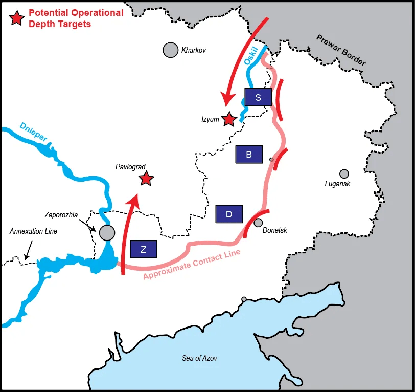 Two operational depth objectives in particular have the potential to shatter Ukrainian logistics and sustainment. These are, respectively, Izyum in the north and Pavlograd in the South. A Russian thrust down the west bank of the Oskil river towards Izyum would simultaneously threaten to cut off and destroy the Ukrainian grouping on the Svatove axis (S on the map) and sever the vital M03 highway from Kharkov. Reaching Pavlograd, on the other hand, would completely isolate the Ukrainian forces around Donetsk and sever much of Ukraine’s transit across the Dneiper [cf. map in title]