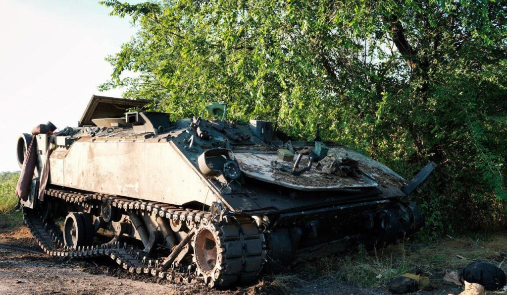 In Kursk region, a Russian drone is showing the impact of one 152 mm guided artillery shell on a US Bradley infantry fighting vehicle (IFV), which was likely carrying ammunition.