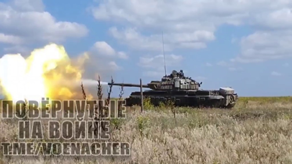 In the suburb of Bakhmut, a Russian T-80 is collaborating with an observer and his drone, is treating a Ukrainian entrenchment at less than 30 m, in order to ease the advance of infantry (screenshot on December 30, 2022)