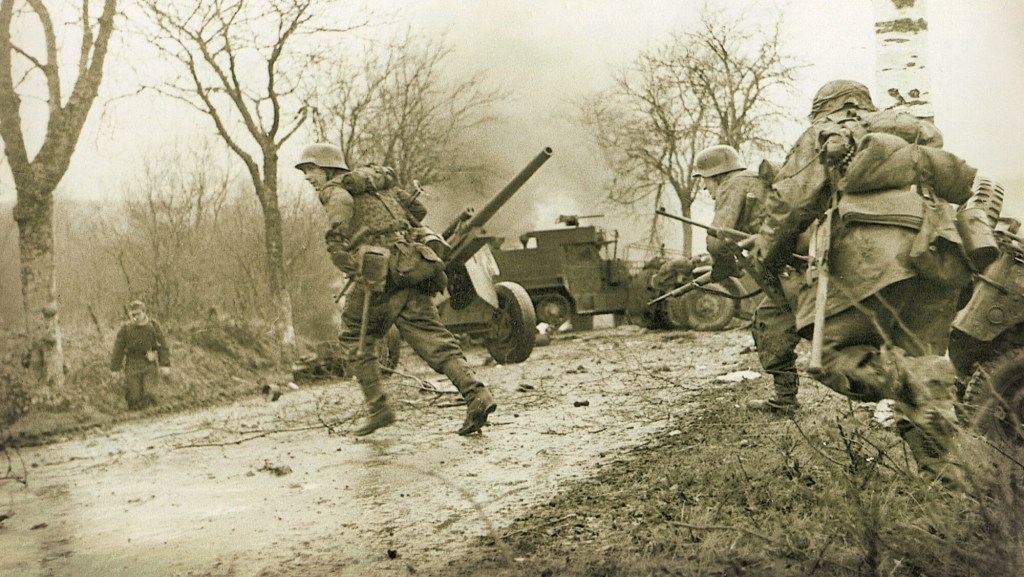 On December 18, 1944, Panzer-Grenadiere of Kampfgruppe Hansen (1. SS-Panzer-Division, Leibstandarte Adolf Hitler) reenact their ambush of US troops, a few hours before, near Poteau, Belgium