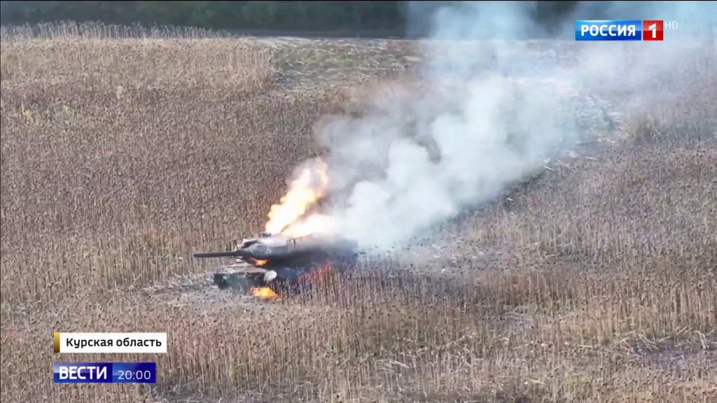 On September 19, 2024, a German Leopard 2A6 is burning in Kursk region (screenshot / Rossiya 1)