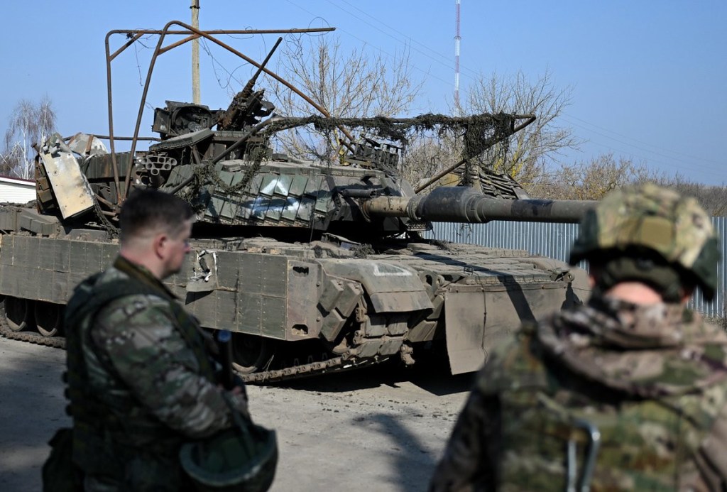 Russian intelligence officers inspect a damaged Abrams tank in the northwestern vicinity of Avdeevka.