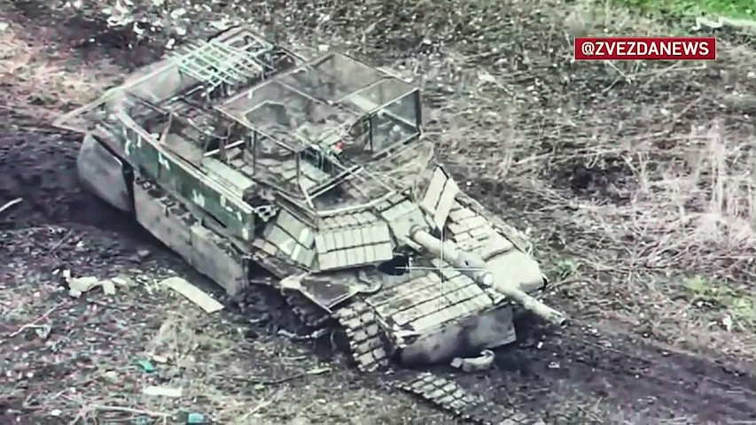 The specimen was heavily reinforced with additional reactive armor and anti drone metal grills.