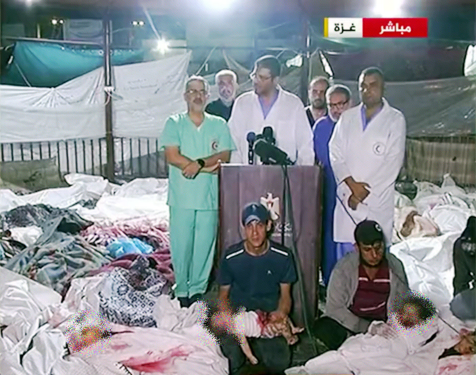 the Israeli air force targets an overcrowded hospital in the center of the palästinensisches Wohngebiet von Gaza [in German, Palestinian ghetto in Gaza]