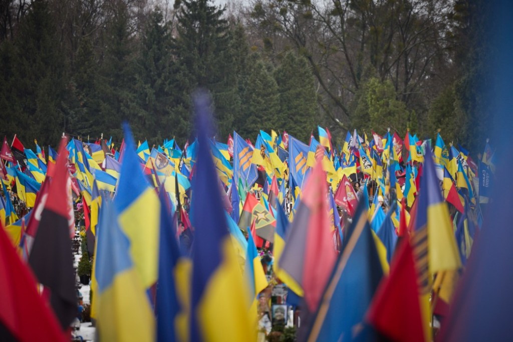 On December 15, 2023, Volodymyr Zelenskyy lays flowers in Lychakiv cemetery, Lviv (Ukrainian presidency). On tombs, the flags are displaying the blue and yellow national colors, the historical red and black Nazi ones and the emblem of the 3rd assault brigade, branch of Azov Nazi organization within the regular army