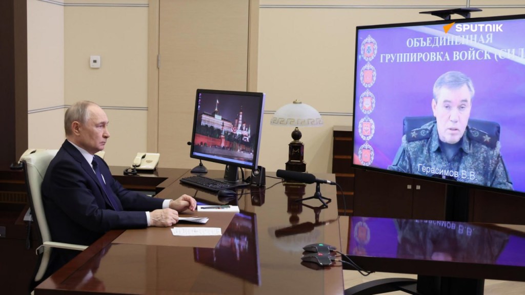 Vladimir Putin visits the headquarter of Zapad [West] group of forces, where chief of staff Valery Gerasimov reports the complete cleansing of Kupyansk, Kharkov region.