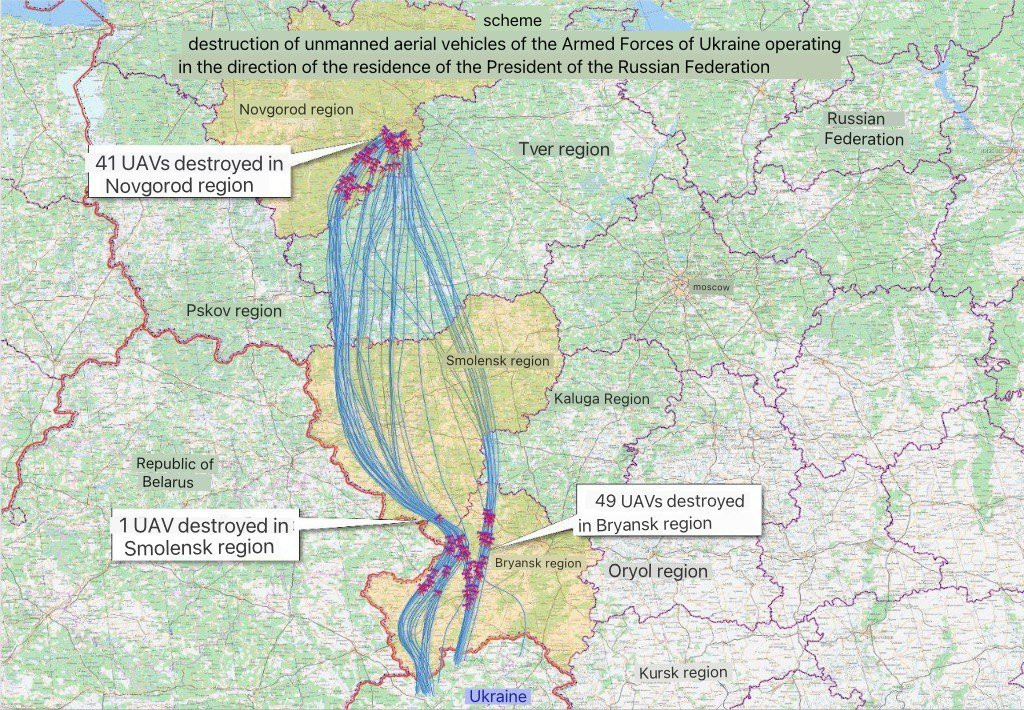 The aircraft are launched to the north from Chernigov and Sumy, in northern Ukraine. 49 are quickly shot down in Bryansk border region, one more in Smolensk. 41, finally, over Novgorod, where the specific site is strongly protected.