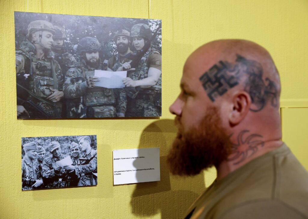 At the exhibition in Kyiv, Kozhemyakin smiled for the camera, posed next to photographs, gave interviews to the press, and openly displayed his elaborate face tattoos, which resemble multiple swastikas. Other tattoos, hidden beneath his olive-green T-shirt, include a giant swastika and a portrait of Adolf Hitler at the center. Notably, in one of the photographs on display, Kozhemyakin participated in the reenactment of a group portrait featuring a unit of Ukrainian Nazi collaborators. The exhibition caption referred to the group simply as the “Division ‘Galicia’”