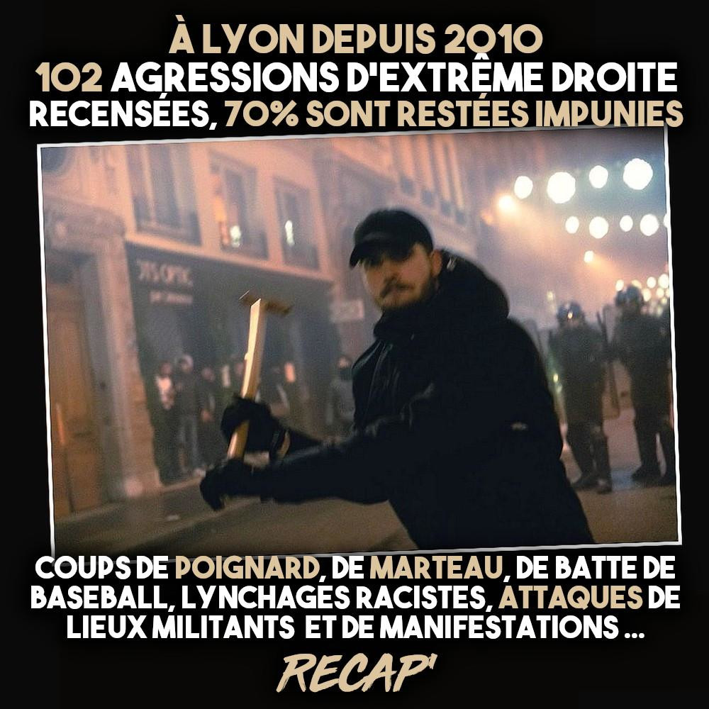 - Entre 2010 et 2013, le nombre d’attaques d’extrême droite explose dans la ville, après l’ouverture de locaux et de salles d’entraînement d’extrême droite. Selon le collectif Vigilance 69, les groupes néofascistes sont à l’origine de quarante agressions physiques rien que ces trois années, représentant cinq cents jours d’incapacité totale de travail uniquement à Lyon !