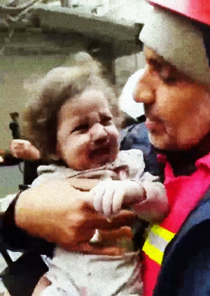 In Tehran, a toddler is pulled from under the rubble of a bombed building.