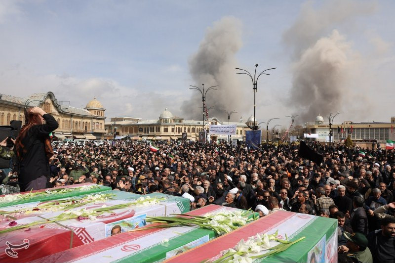 In Hamadan, western Iran, the people bury five victims while bombs are still falling