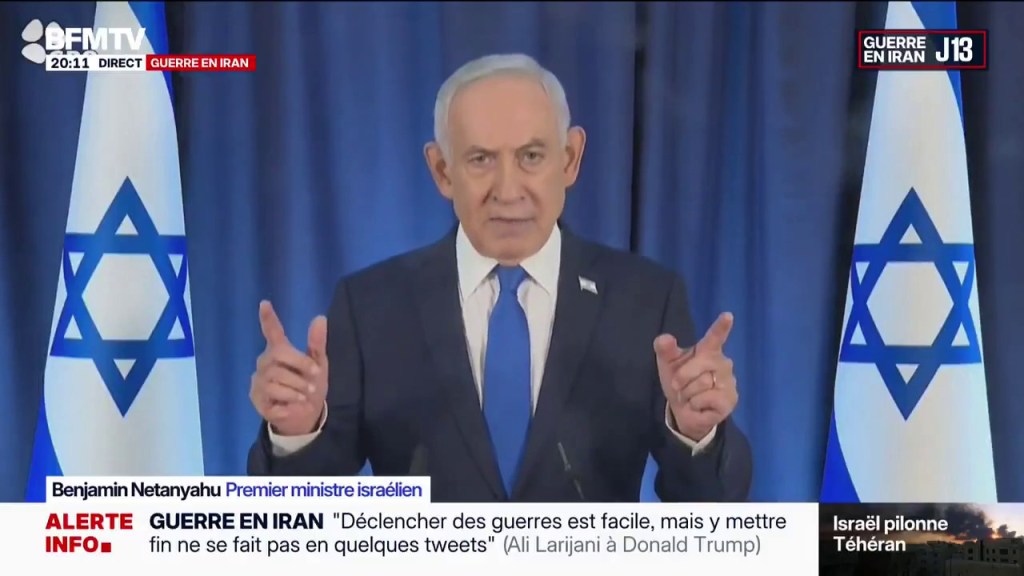 Here on French TV, a digital doppelganger of Benjamin Mileikowsky spoke to the world on March 12, 2026 (screenshot)